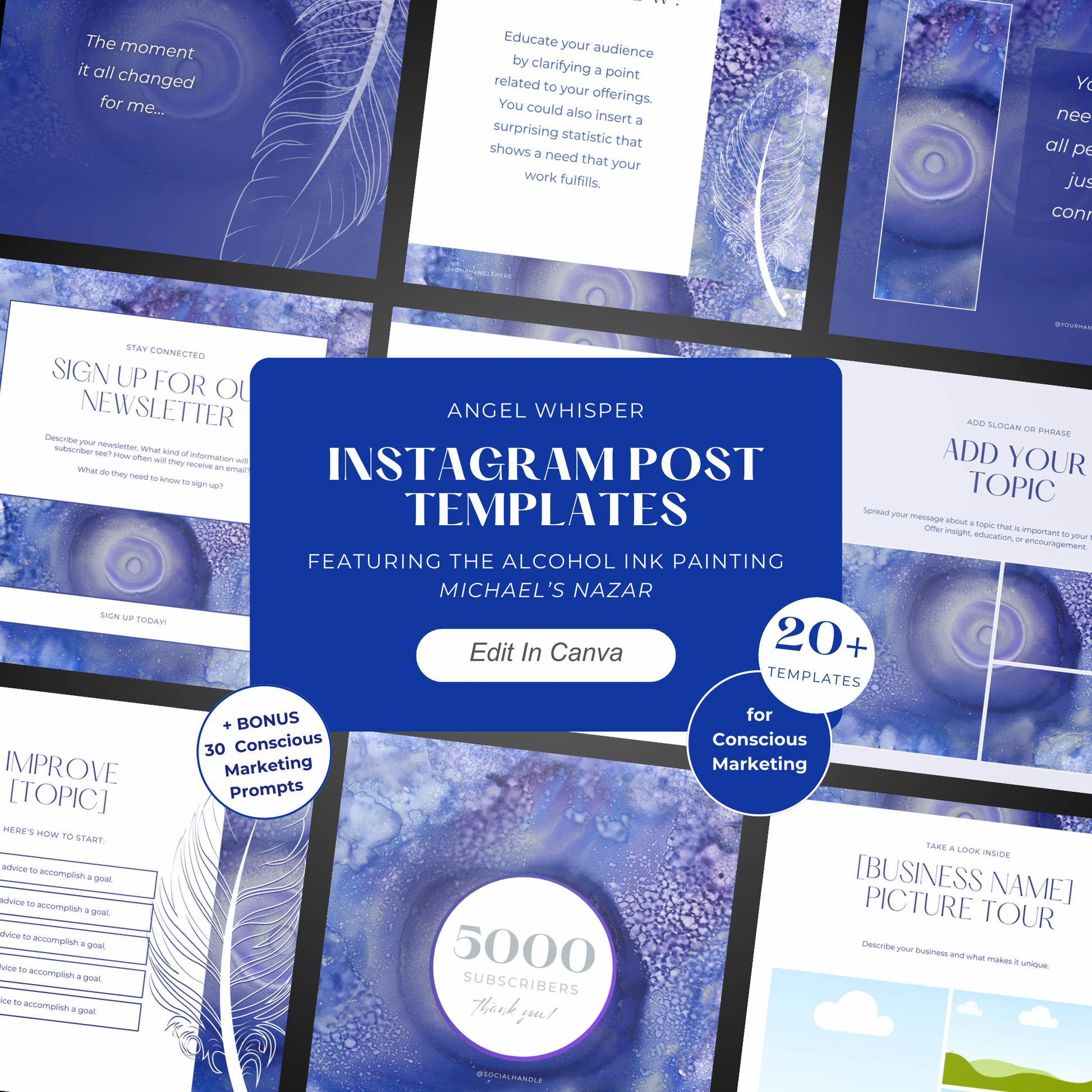 - One Signature Painting – Each post template features the alcohol ink painting Michael's Nazar in a different layout to create a cohesive, on-brand look with celestial beauty.